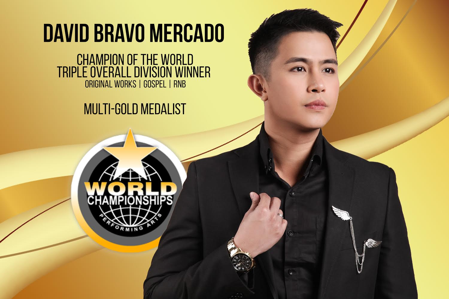 * In 2019, David re-auditioned for the 23rd Annual World Championship of Performance Arts and passed once again. This time, with an approved US Visa, he was selected as an official delegate for the competition, which was held in Long Beach, California on July 12-21, 2019. In this 2019 international talent olympics where performers from more than 70 countries competed, David brought pride to the Philippines by winning an array of awards and recognitions, such as Triple Overall Division Champion and Multi-Gold Medalist. He took home three (3) division champion plaques, four (4) gold medals, one (1) silver medal, and two (2) bronze medals.